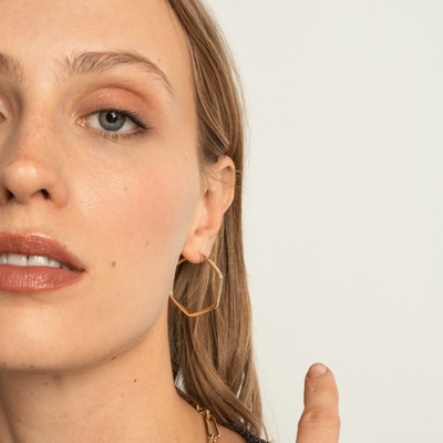 Las argollas Margarett son unos lindisimos aros creados en baño de oro de 18 quilates, poseen forma de un hexágono perfecto para completar todos tus oufits!