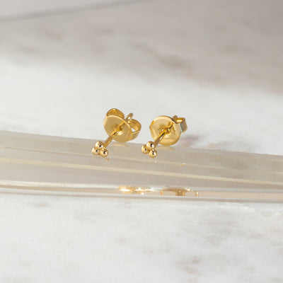 ¡Una unidad de las Iris! Este mini arito es un pendiente bañados en oro de 14 quilates. Son tres pequeñas esferas doradas que juegan con las formas geométricas. Ideal para combinarlas con otros aros de la Nueva Colección.